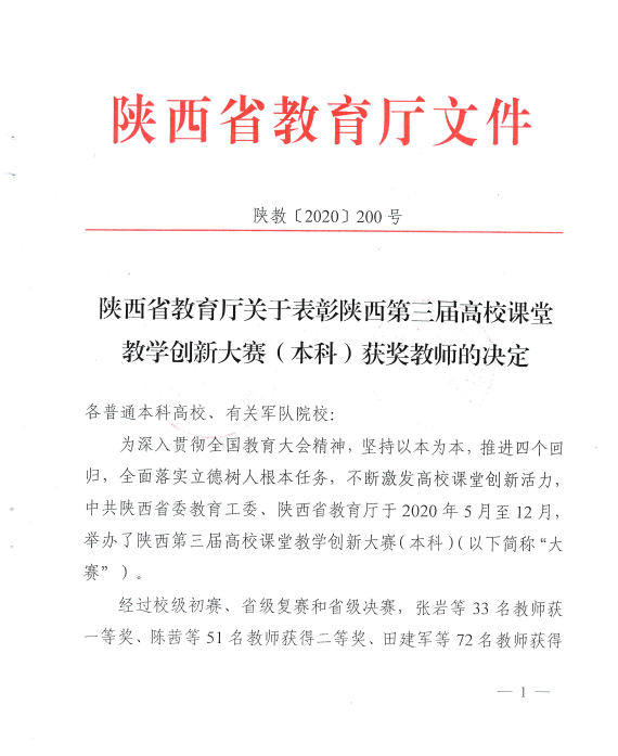 (通讯员 陈龙)日前,陕西省教育厅公布了第三届高校课堂教学创新大赛结果,我院谢琨老师获省级一等奖,取得该赛事开展以来我院最好成绩。