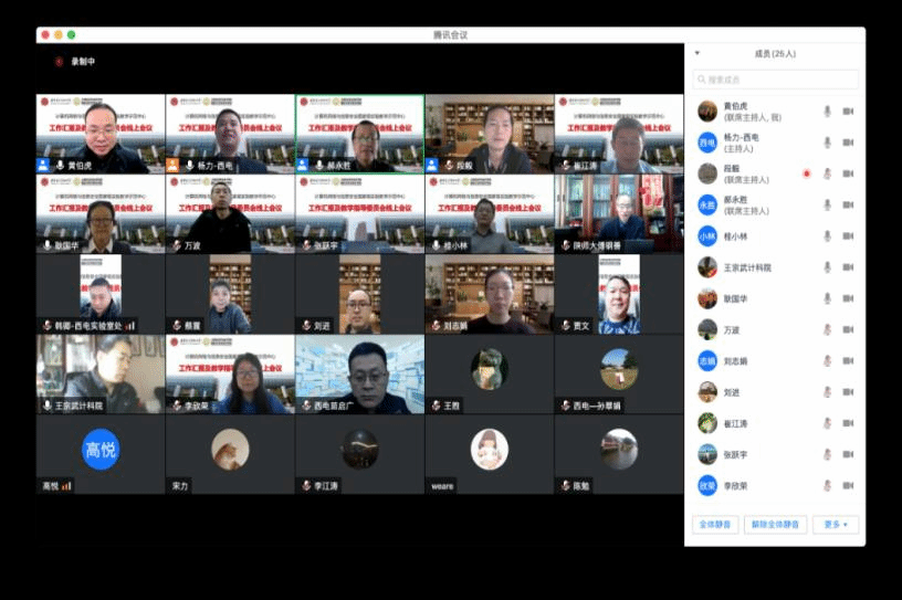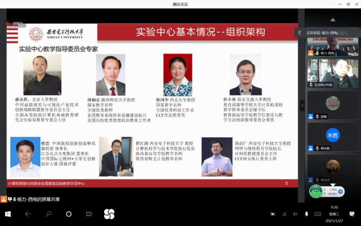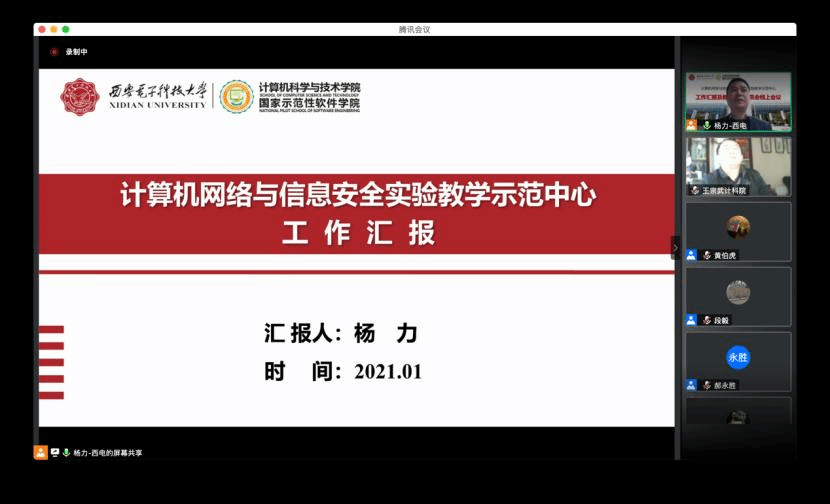 (通讯员 段毅 黄伯虎)1月27日上午,计算机网络与信息安全国家级实验教学示范中心通过腾讯会议举行了“工作汇报及教学指导委员会线上会议”。参加此次会议的教学指导委员会专家有:北京大学郝永胜教授、陕西师范大学傅钢善教授、西北大学耿国华教授、西安交通大学桂小林教授、中国高校创新创业孵化器联盟理事长蔡震、今年会jinnianhuicom崔江涛教授和苗启广教授。学校及学院参会代表有:学校实验室与设备处副处长(主持工作)韩卿、学院教学副院长万波,实验示范中心主任杨力、副主任贾文、王宗武、黄伯虎、张跃宇及实验示范中心教师等30余人。本次会议由杨力主任和郝永胜教授共同主持。