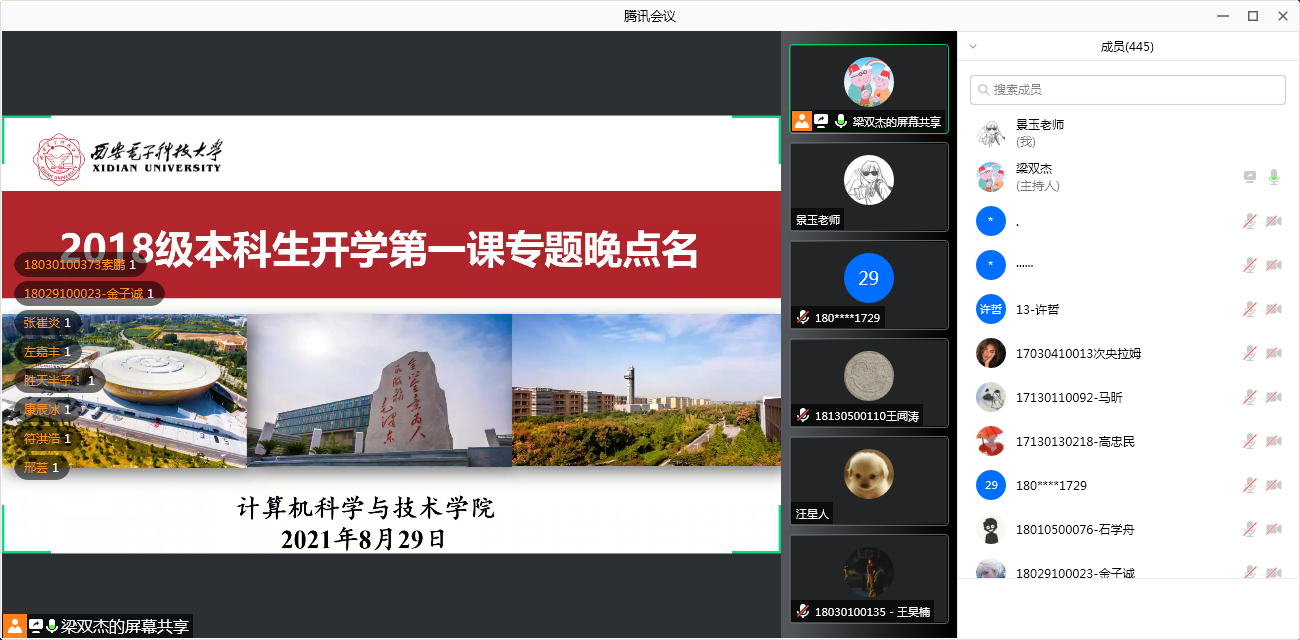 (通讯员 景玉 张力月)2021年8月29日下午,今年会jinnianhui官网面向2018级本科生开展了线上“开学第一课”专题晚点名活动。三位本科生辅导员围绕疫情防控、安全教育、升学深造、就业择业等多个方面向同学们介绍了本学期的重点工作任务,引导同学们早知道、早准备、早规划。