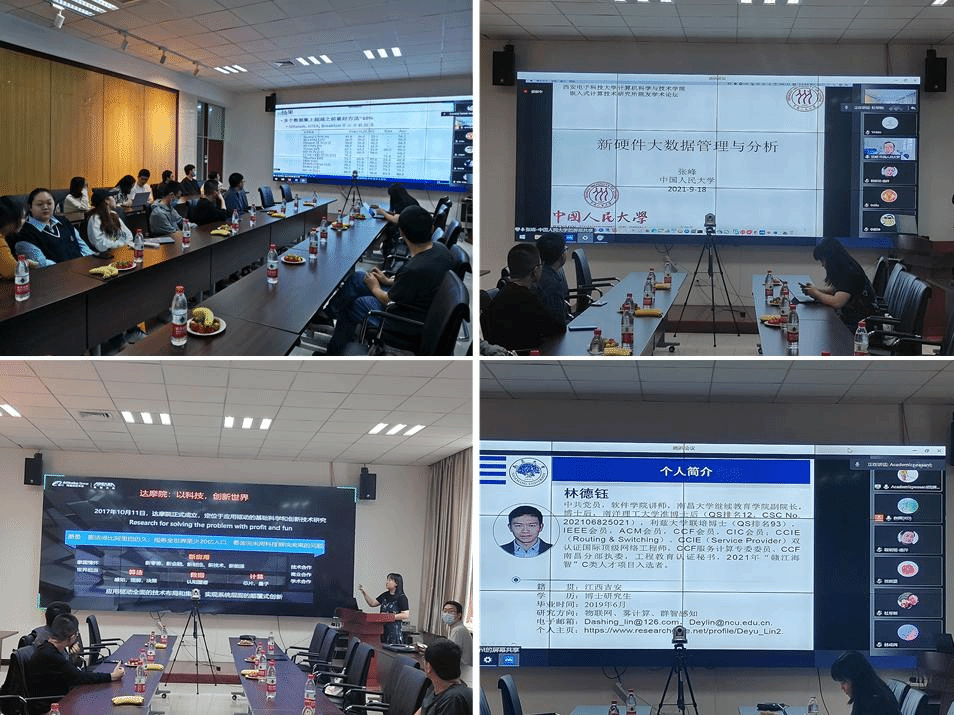 南开大学程明明教授、中国人民大学张峰副教授、阿里巴巴达摩院视觉技术高级算法专家唐铭谦、南昌大学继续教育学院副院长林德钰博士、我校今年会jinnianhui官网讲师黄钊博士先后带来了精彩的报告。程明明教授就大规模图像的多粒度目标检测进行了详细的报告,阐述了从实例、图像、以及整个数据集三个粒度出发,对大规模图像集合进行联合分析,以减少图像理解算法对大规模精确标注依赖的过程。张峰副教授以新硬件大数据管理与分析为主题,并结合大数据管理技术正经历以软件为中心到以数据为中心的计算平台变迁的时代背景,重点关注新型硬件环境给大数据管理与分析领域带来的机遇与挑战,介绍了混合异构硬件环境下大数据应用加速的最新研究进展。阿里达摩院视觉技术高级算法专家唐铭谦介绍了视频内容结构化、多模态搜索、视频场景下内容合成,结合媒体AI及AI编辑部产品,赋能融媒体应用的最新进展。随后,林德钰博士简单综述了万物感知及互联、数能一体化通信的相关进展,深度剖析了两者有机结合存在的重要挑战,理性分析并指出了其科学合理的解决方案。黄钊博士以新时代下"硬件安全"前沿研究技术分享为主题,从可靠和安全两个维度出发,针对物联网等典型应用,探讨了可靠芯片的安防检维技术,深入分析了"硬件安全"问题产生的背景以及目前主要的防护手段和策略。参加论坛的师生与报告嘉宾就相关技术难点和个人职业规划问题进行了深入交流。