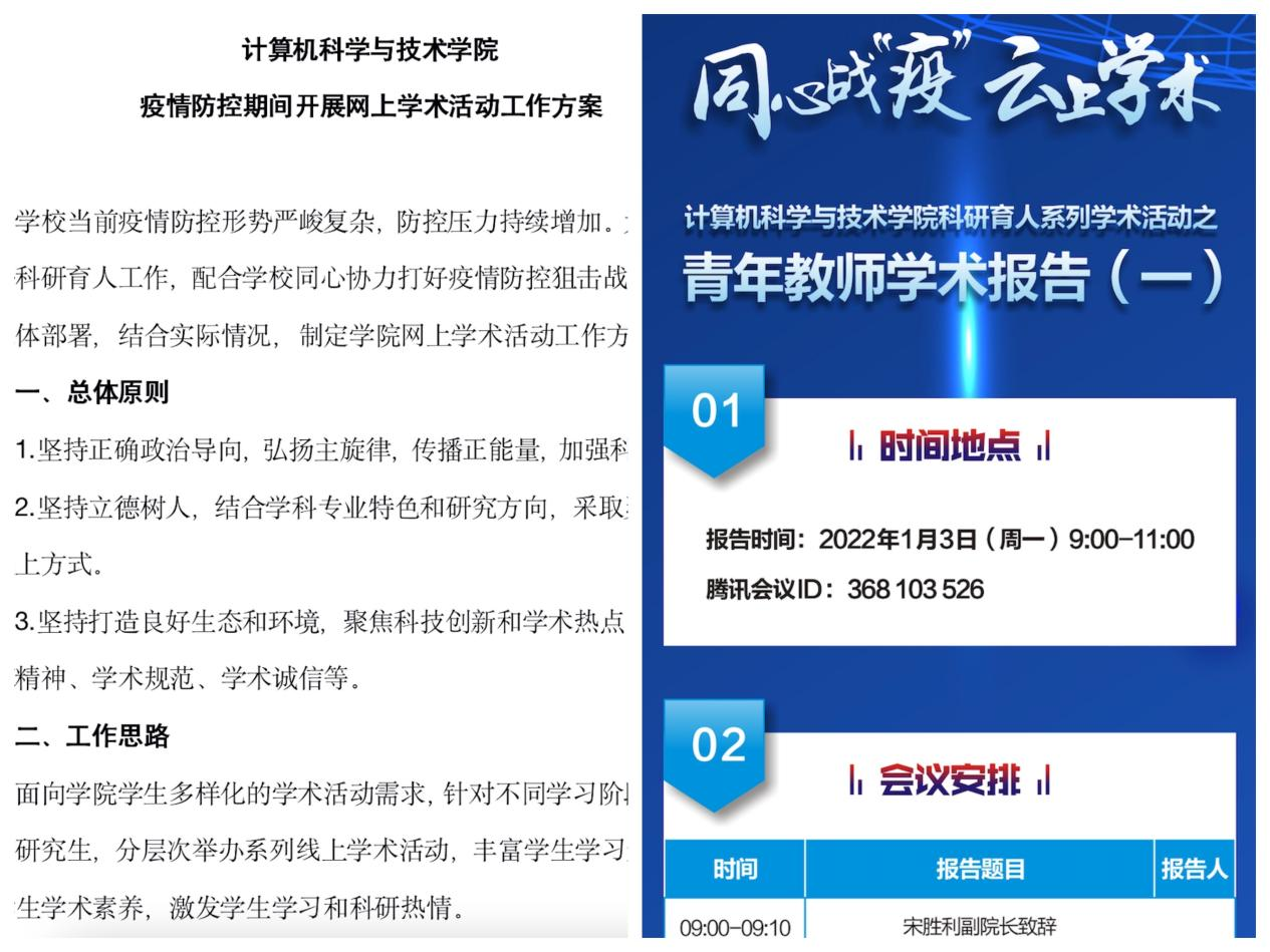 学院稳步推进科研育人工作,按照学校总体部署,加强统筹规划,结合学科专业特色,制定学术活动方案,面向本科生和研究生差异化需求,拟依托8个研究所分层次开展系列学术活动,确保疫情期间学生学术交流不断线。面向本科生一年级和二年级学生,围绕计算机领域基础原理、前沿动态、未来发展等方面开展科普讲座,激发学生学习和科研热情;面向本科生三年级和四年级,组织8个研究所介绍各自科研、研究生培养等情况,加强本科生对研究生生涯了解,帮助学生明确读研或就业的目标。面向全体研究生,邀请青年教师开展科技前沿学术报告,激发研究生科研兴趣和积极性。