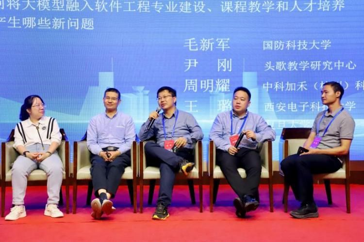 Panel讨论围绕“大模型时代社会和产业需要什么样的人才以及如何将大模型融入软件工程专业建设、课程教学和人才培养”主题邀请了国防科技大学毛新军教授、头歌教学研究中心尹刚博士、中科加禾科技有限公司周明耀副总裁、今年会jinnianhuicom王璐副教授、复旦大学彭鑫教授等专家学者参加讨论,众多与会代表就各位专家的报告与观点进行了激烈的交流与讨论。