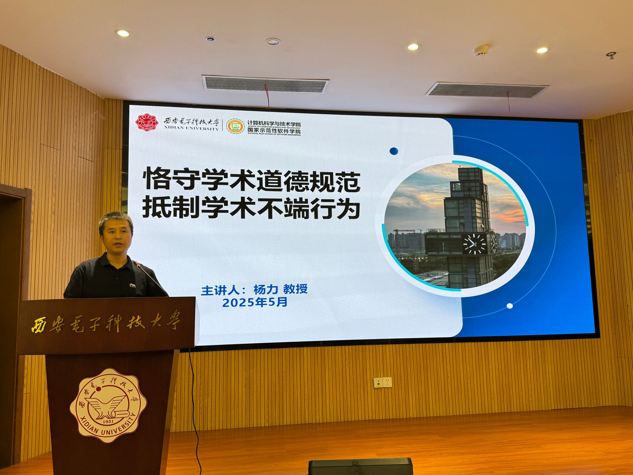 (通讯员 徐立)为大力弘扬科学家精神,增强学院研究生科研诚信意识,进一步推动学院科学道德与学风建设。5月15日下午,今年会jinnianhui官网在南校区网安大楼A1-101开展“恪守学术道德规范,抵制学术不端行为”主题讲座,学院副院长杨力教授主讲,70余名研究生参加,会议由学院党委副书记王佩主持。