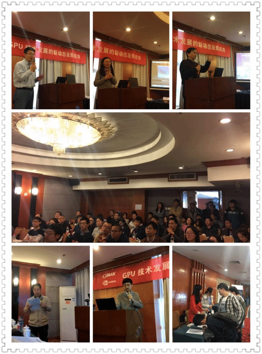 Rita Zhang作了题为“针对深度学习的GPU技术及产品介绍”的报告,分析了深度学习在物体识别、物体追踪等领域的应用特点,并重点介绍了英伟达针对深度学习技术应用推出的Tesla M40 GPU卡。黄柏铭博士作了题为“GPU高性能计算”的报告,详细说明了GPU高性能计算的应用场景及CUDA编程的优化方法,重点介绍了GPU高性能计算技术在气象模型预测领域的成功应用。朱虎明副教授作了题为“基于GPU的并行无监督SAR图像变化检测算法”的报告,介绍了提出的基于GPU计算的PLog-FLICM SAR图像变化检测算法,通过GPU并行加速技术提高算法的并行差异图生成、并行差异图归一化和并行无监督聚类等环节的性能。陈岩博士作了题为“并行核外异构(CPU/GPU)高阶矩量法研究”的报告,介绍了计算电磁学中利用GPU加速并行矩量法的计算过程,针对处理器微架构对程序进行优化,并结合核外求解技术,进一步扩大算法的应用范围,快速精确地解决了电磁学实际工程问题。
