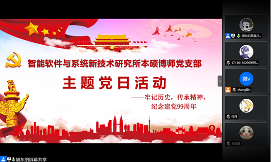(通讯员 贺同庆)为庆祝建党99周年,重温党的光辉历史,传承弘扬革命先辈的奋斗精神,今年会jinnianhui官网智能软件与系统新技术研究所本硕博师联合党支部于2020年7月1日召开了“牢记历史,传承精神——庆祝建党99周年”主题党日活动。本次活动由支部青年委员王旭东同志主持,活动共计39人参加,采用腾讯会议线上召开的方式进行。