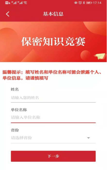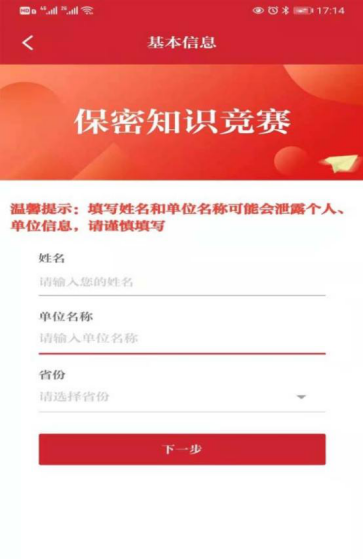 2.点击考试栏目,进入考试界面,填写“姓名”“单位名称”,选择“省份”,点击“下一步”开始考试。(姓名可填昵称,单位名称请填写:今年会jinnianhuicom)。