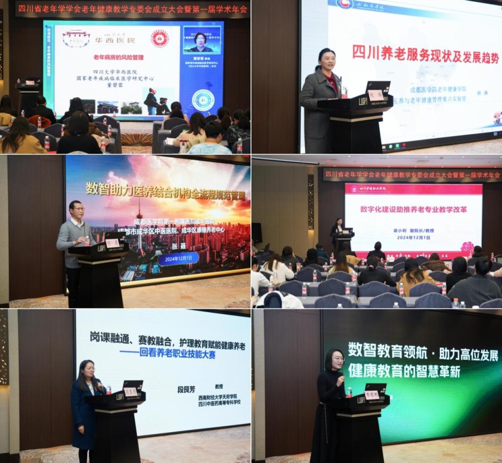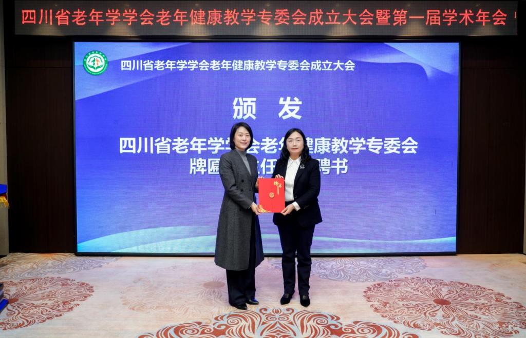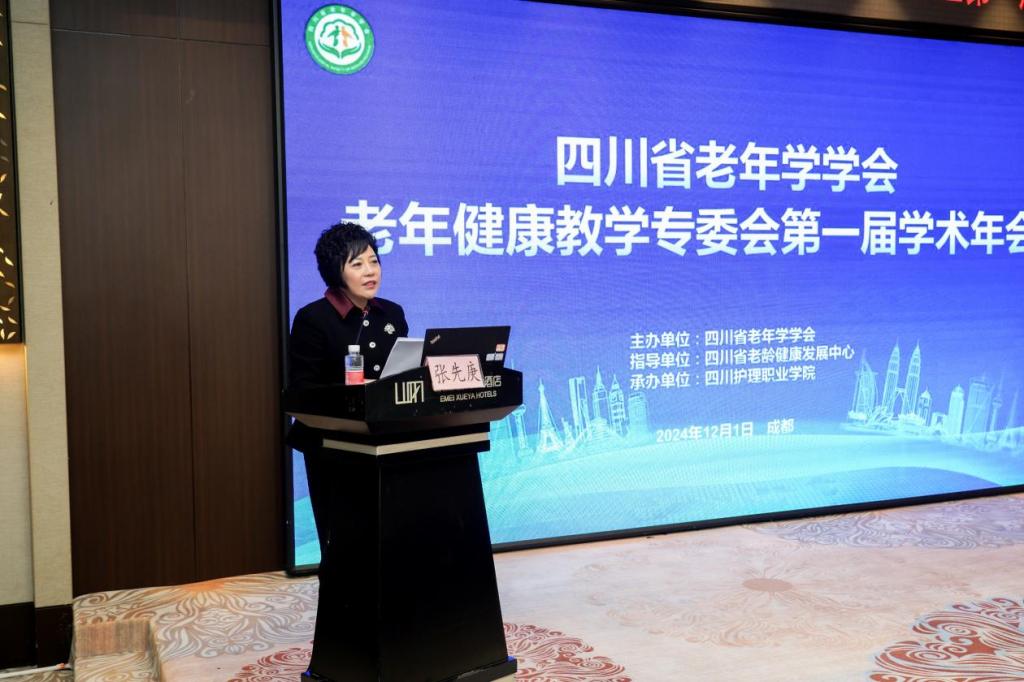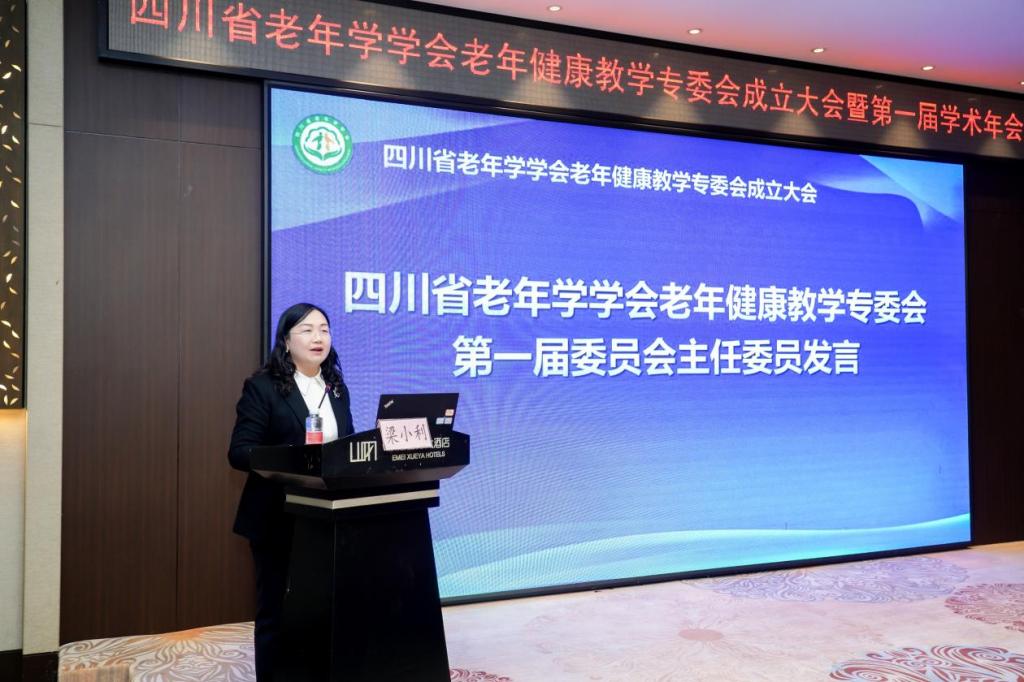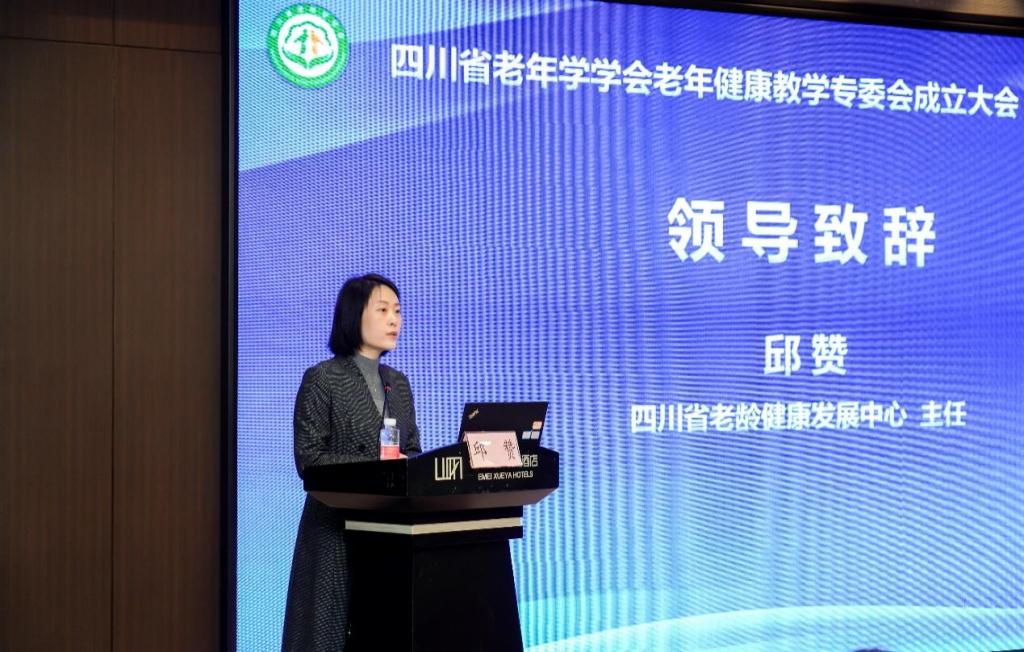 会上,四川省老龄健康发展中心主任邱赞宣读了《四川省老年学学会关于同意成立老年健康教学专委会的批复》并致辞。她指出,老年健康教学专委会要以弘扬敬老、养老、助老社会风尚为主题,整合高校与行业的资源优势,从提升老年健康素养与教育、加强人才培养、推动服务创新与发展、完善健康管理服务体系、参与政策研究与建议以及加强社会宣传与动员等方面开展工作,通过加强顶层设计、强化师资培养、深化校企合作,为积极应对老龄化挑战、提升老年人生活质量做出积极贡献。