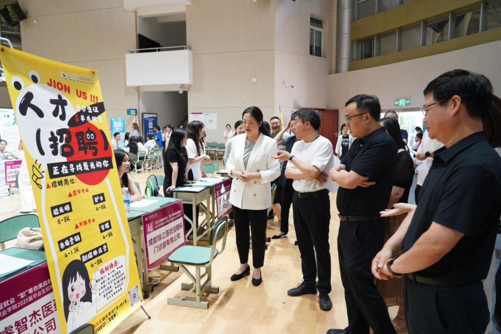 学院党委副书记、院长姚永萍,党委副书记彭博文,党委委员、副院长陈劲松,党委副书记、纪委书记罗小强在招聘会现场与用人单位代表深入交流,详细了解用人需求、岗位要求及行业发展动态,并对各用人单位长期以来对学院就业工作的支持表示感谢,就深化校企合作、优化人才培养模式等方面与用人单位进行了探讨,为进一步拓宽就业渠道奠定基础。现场,院领导们与同学们深入交流,引导他们积极就业,先就业再择业。