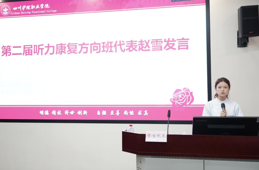 第二届听力康复方向班新生代表赵雪郑重承诺,将始终秉持赤子之心向学、以谦逊之态问道、以仁者之怀践诺,努力成长为有知识底蕴、有能力担当、有温度情怀的听力康复师。