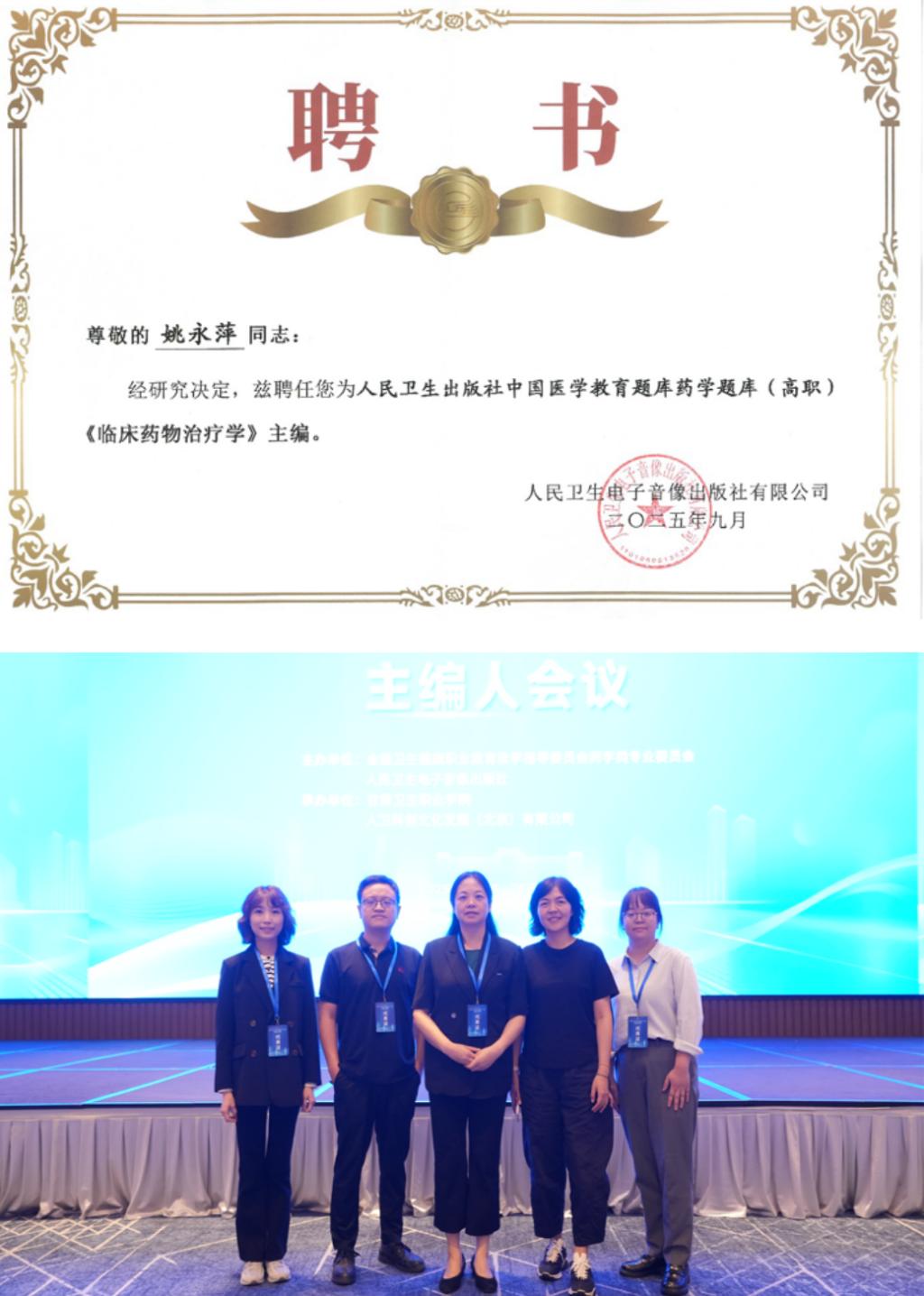为贯彻落实教育部2025年修订的高等职业教育专科药学专业教学标准,深化教育教学评价改革,9月27日,由人民卫生电子音像出版社、全国卫生健康职业教育教学指导委员会药学类专业委员会联合主办的“中国医学教育题库药学题库(高职)主编人会议”在兰州召开。会议汇聚全国28所药学职业院校专家,旨在构建科学化、标准化的教育评价新模式。学院党委副书记、院长姚永萍教授作为专家评审委员会委员及《临床药物治疗学》课程题库主编受邀出席,并获颁聘书。