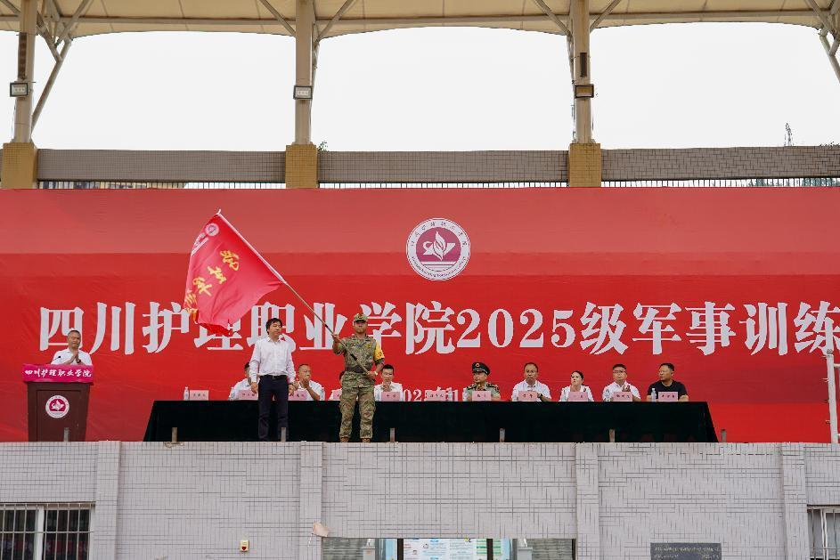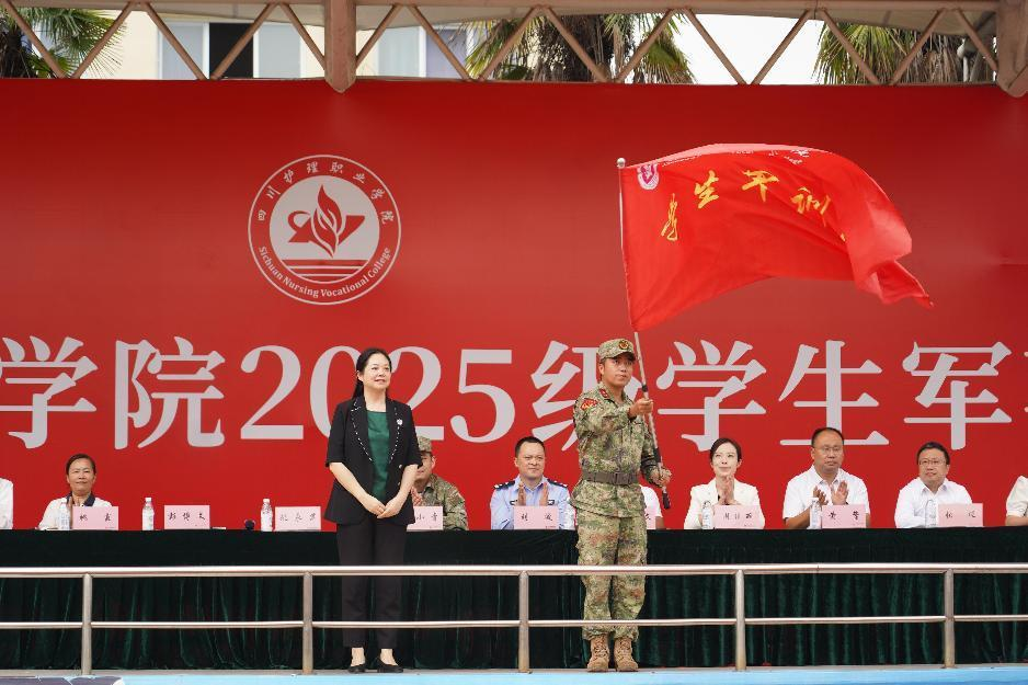 在嘹亮的军乐声中,姚永萍、彭博文分别向两校区军训团授旗,并宣布2025级学生军事训练正式开训。