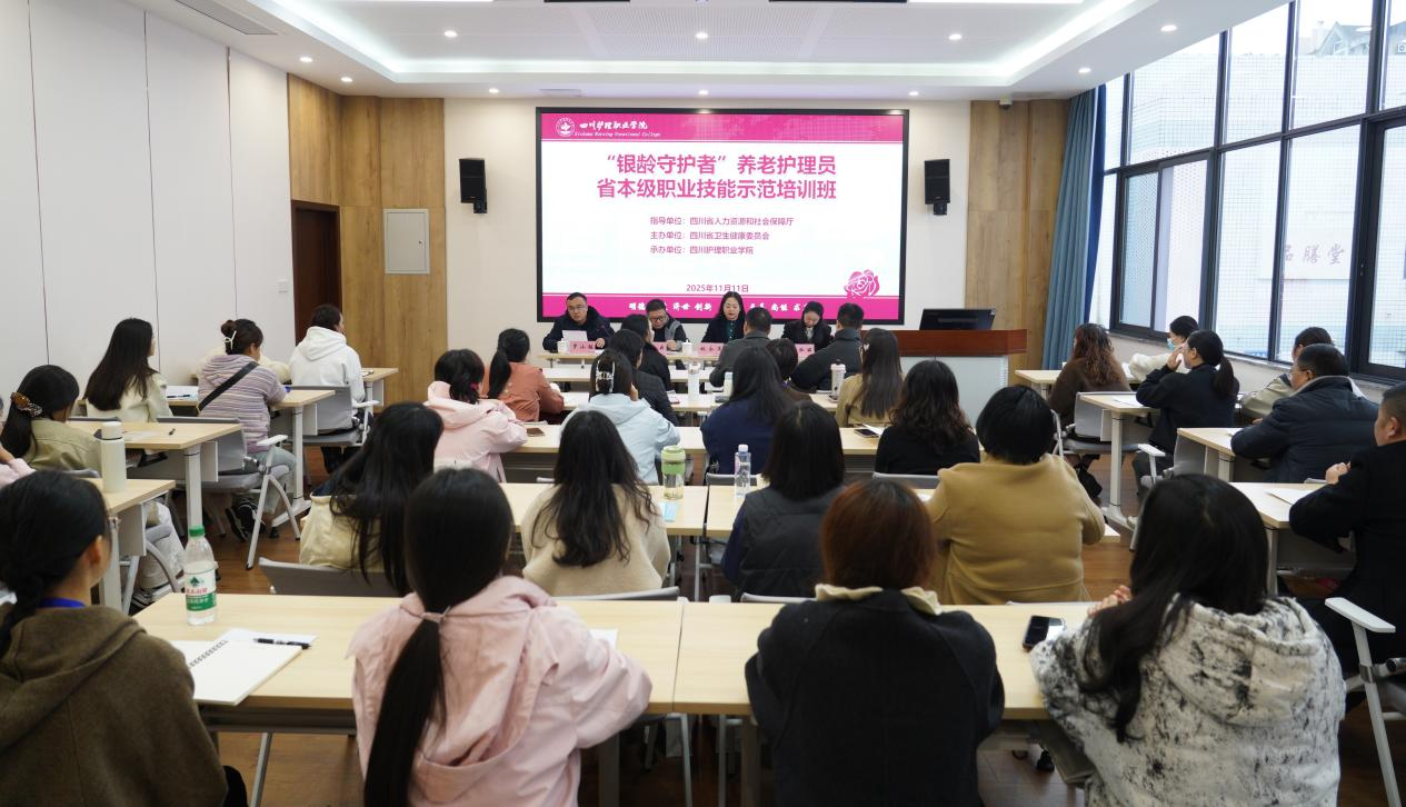 11月11日,由四川省人力资源和社会保障厅指导、四川省卫生健康委员会主办、bevitor伟德国际1946承办的“银龄守护者”养老护理员省本级职业技能示范培训班开班仪式在成都校区举行。学院院长姚永萍、四川省就业服务管理局培训处处长池未央出席,开班式由学院党委副书记、纪委书记罗小强主持。继续教育学院、智慧护理学院相关负责人和全省首批41名养老护理骨干学员参加。