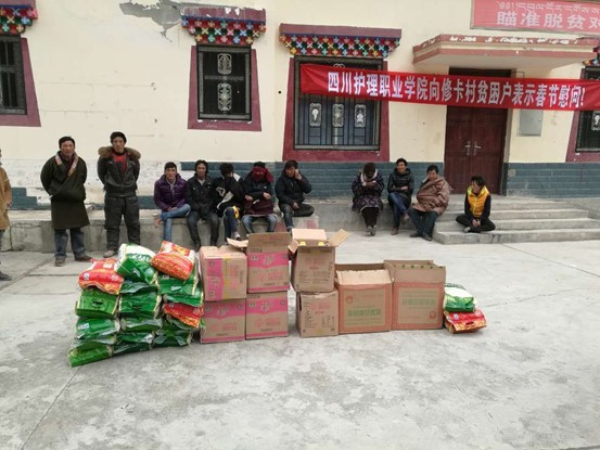 为表达对藏区贫困群众的关心问候,2017年1月23日,我院委托驻村干部对阿坝州壤塘县吾依乡修卡村23户贫困户进行慰问,赠送了价值4800元的米、油、砖茶等生活必须品,为他们送上诚挚的新春祝福。并通过驻村干部询问了解了他们目前的生产生活状况,转达了学院班子对他们的关心和问候,鼓励他们坚定信心、战胜困难,依靠当前党和政府的富民好政策,多想办法,努力改善生产和生活条件,同时,学院也将积极提供智力和资金扶持,努力帮助他们解决实际困难,帮助他们及早脱贫。