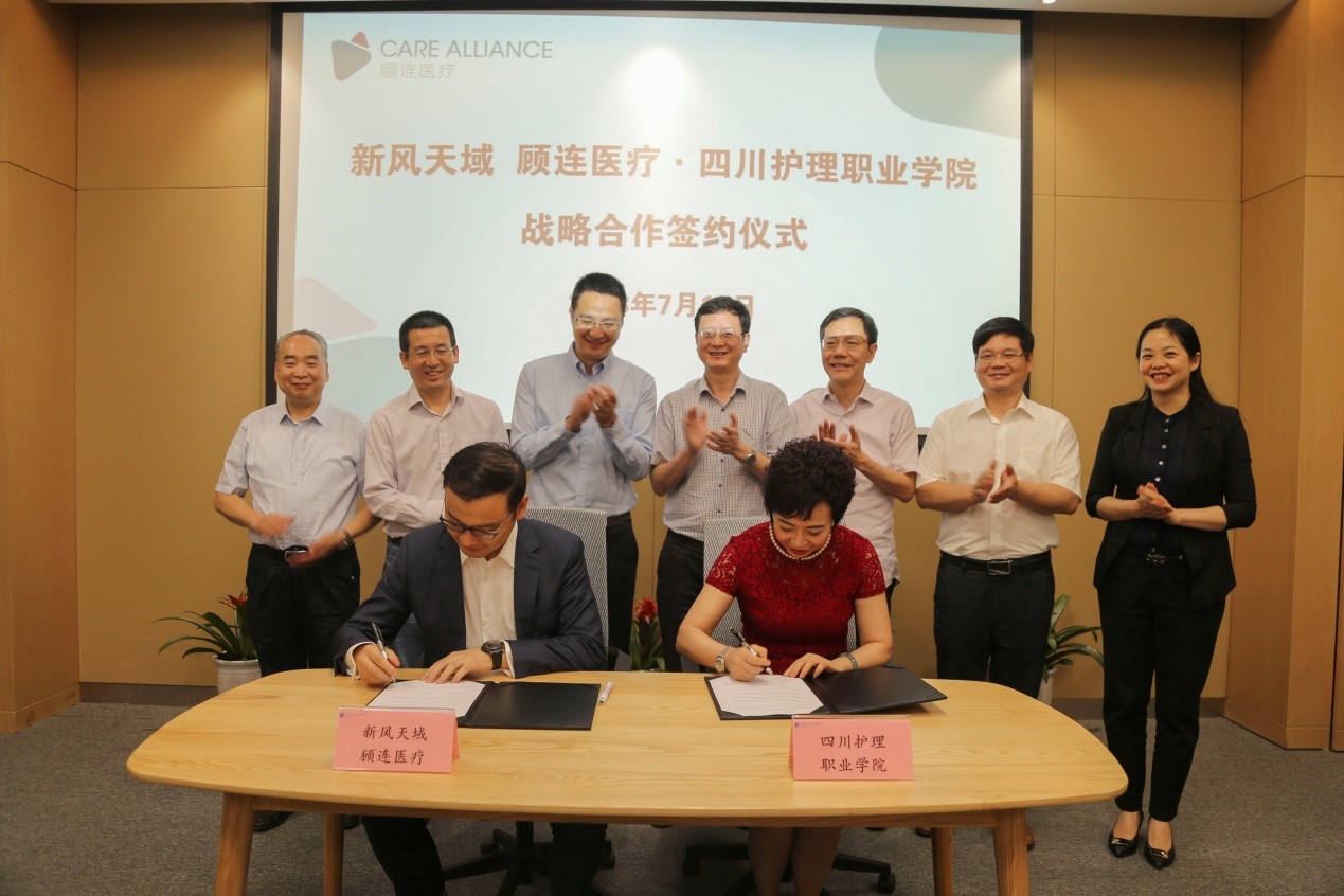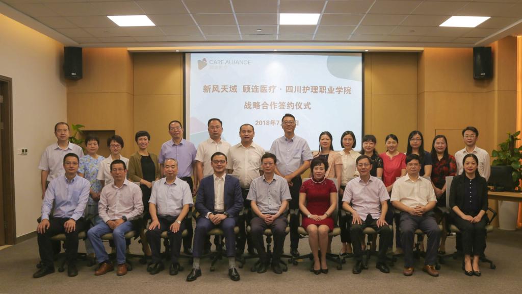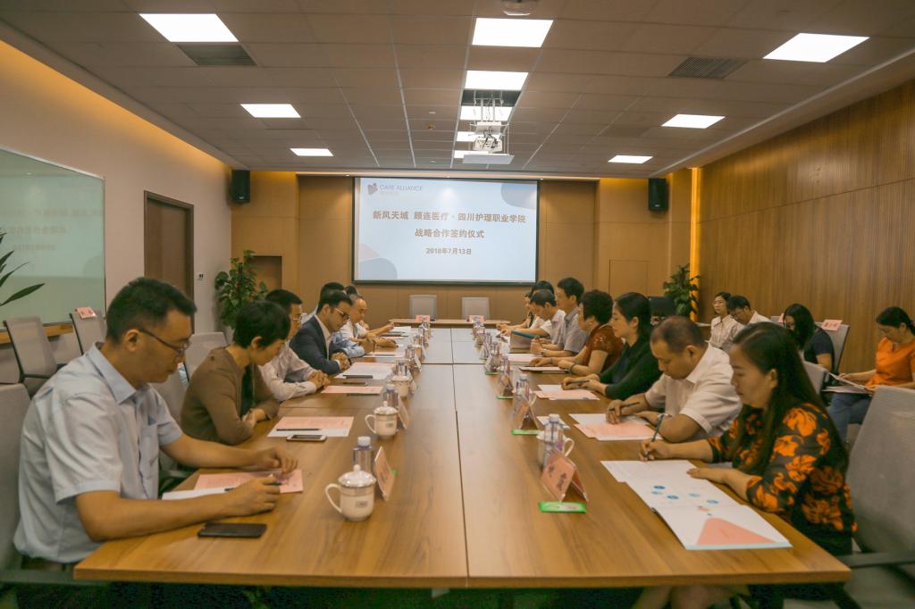 为深入贯彻落实十九大精神,推进校企合作,创新医教协同、产教融合育人模式,实现资源共享,共赢发展,提升医养结合人才培养质量,7月13日上午,学院与新风天域、顾连医疗战略合作签约仪式在成都顾连康复医院举行。顾连医疗联合创始人兼联席执行长袁帅、事业发展部总监唐登才、人力资源部总监张明霞、运营部总监陶志强、成都市老年康疗院院长肖洪松、成都顾连康复医院总经理潘锦宇、医疗院长张安任、我院党委书记江涛、院长张先庚、副书记张志林、副院长陈劲松、副院长姚永萍及双方各职能部门负责人等出席签约仪式。