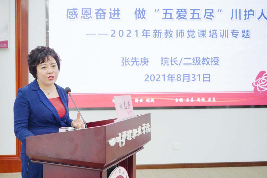 为提升新教师的师德素养,尽快融入川护大家庭,成为“五爱五尽”川护人,8月31日,学院在成都校区举行2021年新入职教师专题培训会。学院党委书记江涛、院长张先庚出席会议,相关部门负责人、51名新教师参加会议。会议由副院长陈劲松主持。