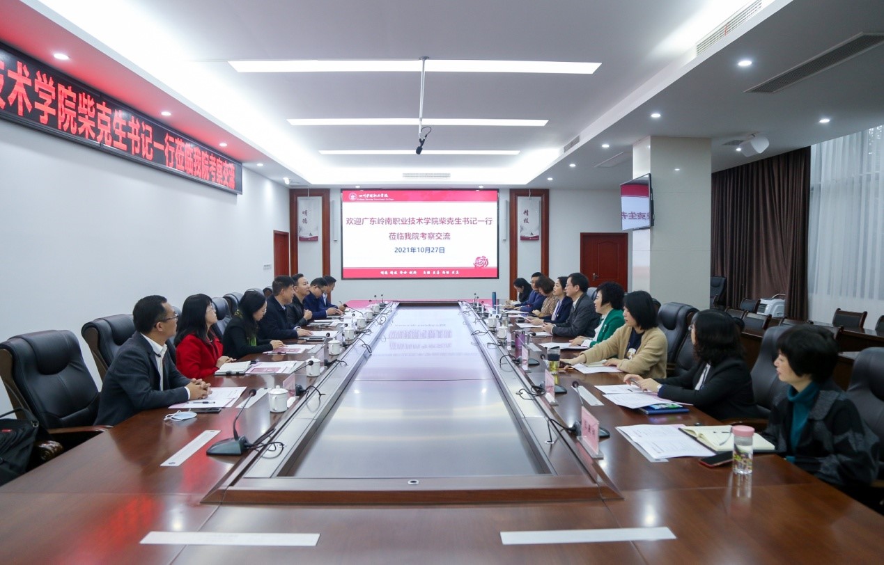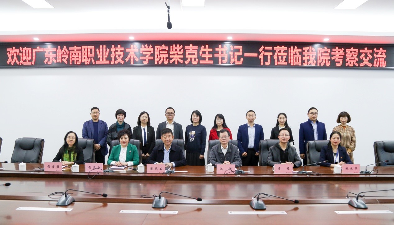 2021年10月27日,广东岭南职业技术学院党委书记柴克生一行到我院考察交流。学院党委书记江涛、院长张先庚、副院长姚永萍及相关部门负责人陪同参加了考察交流活动。