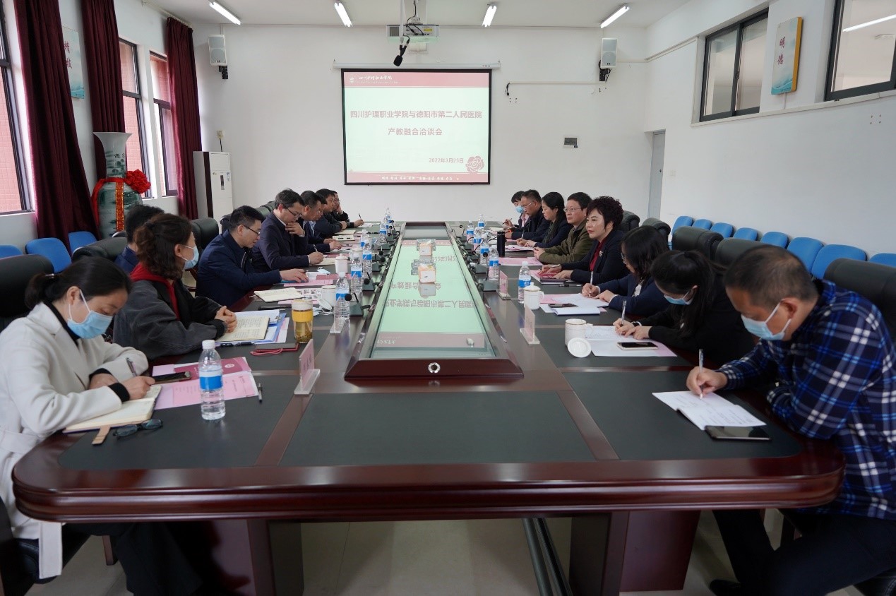 2022年3月25日下午,德阳市第二人民医院党委书记聂海、院长张德军带领院班子及业务部门一行到学院德阳校区就产教研等院校合作事宜开展交流活动。学院党委书记江涛、院长张先庚及相关部门负责人参加活动。
