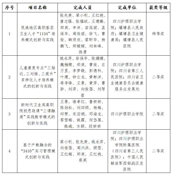 近日,四川省人民政府发布了《关于公布2021年四川省教学成果奖的通知》(川府函〔2022〕85号),我院以“民族地区高职基层卫生人才‘1134’培养模式创新与实践”为代表的4项教学成果分别荣获四川省职业教育教学成果奖特等奖1项、二等奖3项,实现了学院在此奖项上的历史性突破。