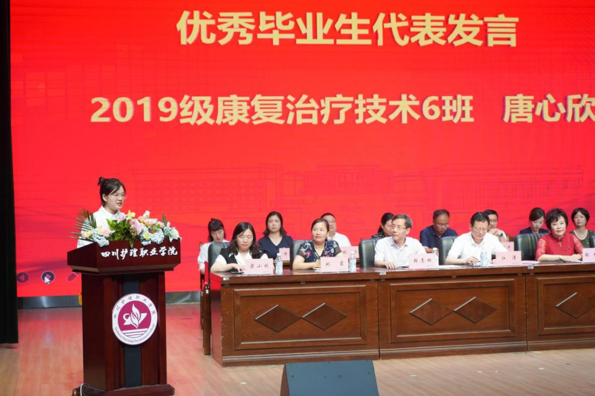 毕业生代表、2019级康复治疗技术6班唐心欣同学在发言中感谢母校的培养和老师们的谆谆教诲。她表示,作为川护学子,一定要以崇高的理想、坚定的信念、无畏的勇气展现我们青年一代的智慧、风采和力量,学以致用,为社会发展、人民健康贡献自己的力量。