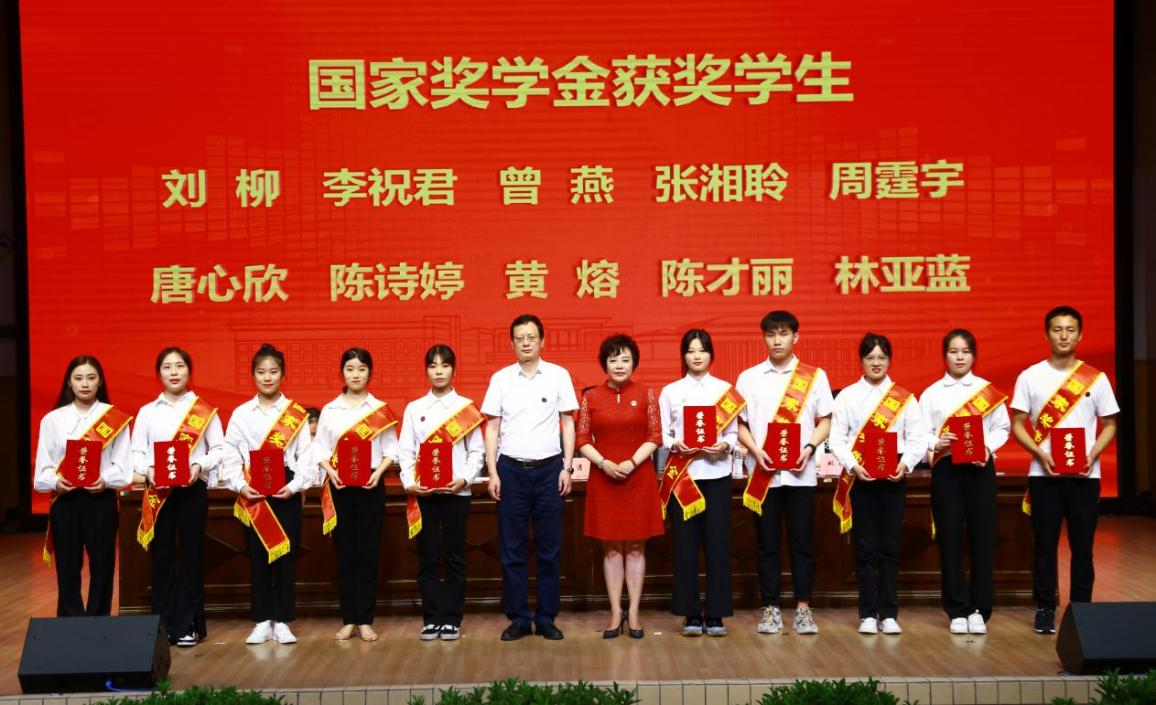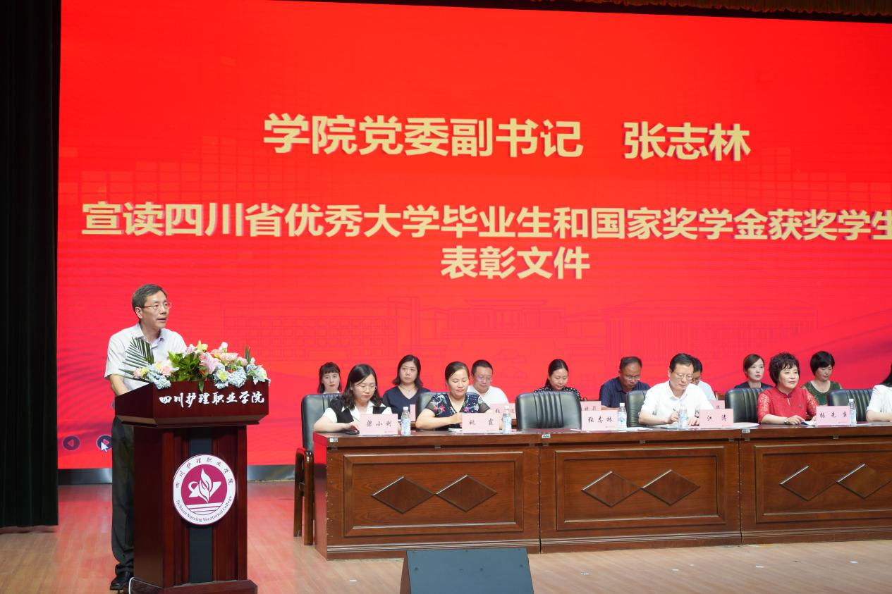 学院党委副书记张志林宣读了《关于表彰2022届四川省优秀大学毕业生的决定》和《关于表彰2020-2021学年国家奖学金获奖学生的决定》文件,10名省级优秀毕业生代表和10名获得国家奖学金的学生上台领奖,并合影留念。