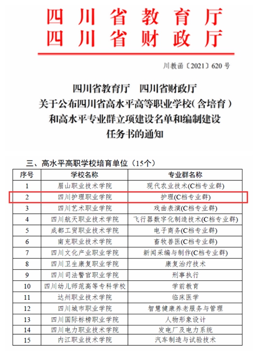 学院获批四川省“高水平高职学校培育单位”,护理专业入选高水平专业群