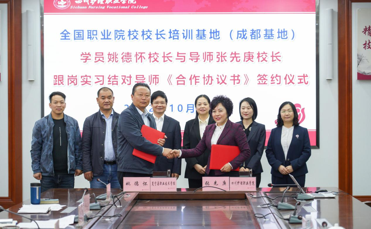 10月25日,“四川省第二批中职卓越校长班”跟岗实习结对导师签约仪式在学院成都校区举行。跟岗实习导师、学院党委副书记、院长张先庚,学院副院长姚永萍,四川省中职卓越校长班学员、冕宁县职业技术学校党委书记、校长姚德怀,两校相关职能部门负责人参加仪式。学院副院长陈劲松主持签约仪式。