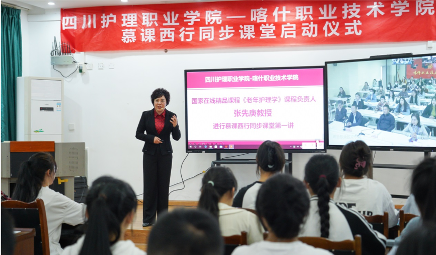 在全面贯彻落实党的二十大精神之际,为积极响应教育部“慕课西行”号召,推进优质教学资源共享,实现教育资源均衡,4月13日,依托智慧树在线教育平台,学院40名学生与喀什职业技术学院14名教师和550名护理专业学生横跨3900余公里,共享《老年护理学》精品课程“云端”教学,实现了优质教学资源的互联互通。学院党委书记江涛、院长张先庚、党委副书记彭博文、副院长梁小利和喀什职业技术学院党委书记李怀仁、副院长张世亮及相关部门、系部负责人参加首讲启动仪式。
