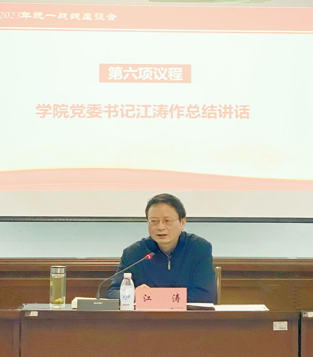 江涛在总结讲话中强调,党外人士是学院发展不可或缺的重要力量,学院党委一直高度重视统一战线工作。他提出三点希望,一是要持续强化理论武装,切实把思想和行动统一到党中央、省委、省政府的重大决策部署上来,坚持不懈用习近平新时代中国特色社会主义思想凝心聚魂,自觉做“两个确立”的坚决拥护者和“两个维护”的坚定实践者;二是要充分发挥统战力量,始终牢记落实立德树人根本任务,努力成为“好老师”“大先生”,继续发挥人才优势,积极投身到学院“双高”建设、中心工作、社会服务、教学改革和乡村振兴中,积极建言献策,为学院事业高质量发展贡献力量;三是要扎实做好统战工作,相关部门要认真吸纳落实与会人员提出的中肯意见建议,尽快搭建起党外知识分子联谊交流平台,进一步提升统战工作质量。
