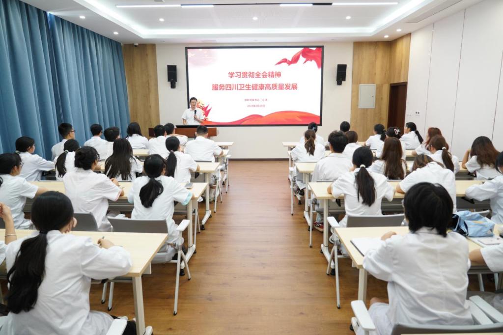 6月25日,学院党委书记江涛在成都校区为2022级医学影像技术2班学生讲授题为《学习贯彻全会精神 服务四川卫生健康高质量发展》的主题党课,解读省委十二届五次全会精神,基于服务四川卫生健康高质量发展思路举措,结合“新质生产力”、“创新”和“科技”等关键词,探讨医学影像专业的发展及就业前景。