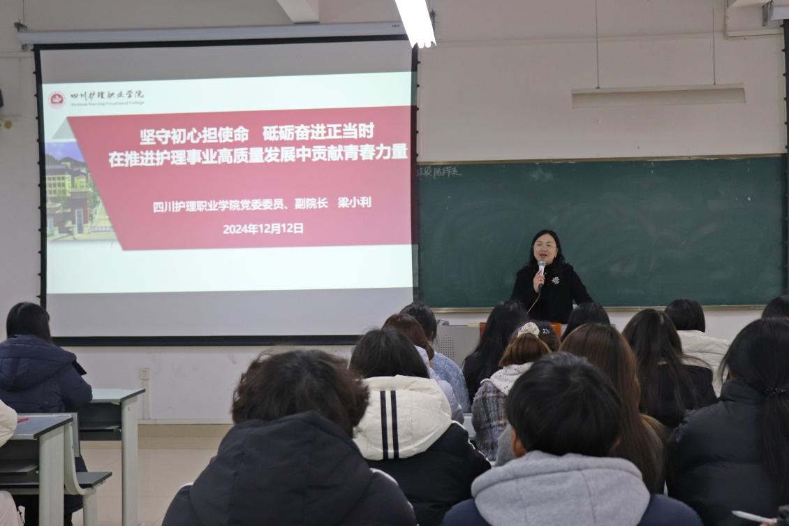 12月12日,学院党委委员、副院长梁小利在德阳校区为联系班级2024级护理大专9班全体学生讲授形势与政策课。