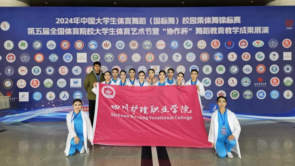 12月8日至13日,由中国学生体育联合会主办的2024年中国大学生体育舞蹈(国标舞)校园集体舞锦标赛在武汉举办,由基础部教师郭芮良带队代表学院参赛,与来自全国49所高校、1500多名选手同台竞技。学院参赛队最终斩获大学艺术表演舞蹈大学乙A组第一名、中级单人校园集体舞华尔兹乙A组第一名的好成绩,郭芮良被评为优秀教练员。参赛选手在赛场上充分展示了美与艺术融合的融合创新,将医护工作者救死扶伤、与死神争夺生命的情节融入体育舞蹈之中,展示了川护人“五爱五尽”家校情怀和坚韧不拔的精神风貌。