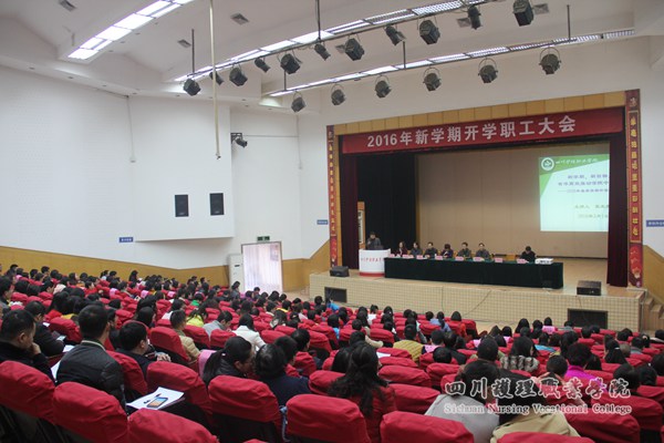 会上,张院长从本学期十个方面工作入手,在重点部署本期工作的同时,就学院近期、远期发展思路和方向与大家交流、讲解。强调学院坚持“两手抓,两手硬”的工作思路,即:一手抓学院发展,一手抓民生福利;坚持“立德树人,尚能精技,凸显特色,创新发展”办学理念;坚持“立德为先,管理治院、人才强院、特色立院、实干兴院”的办院宗旨。她希望全体教职工将自身发展与学院发展有机融为一体,共促院校发展。在本学期大家应转变观念、全力以赴做好:一是全面开展院校“一体化”建设工作。重点做好领导干部选拔与分工,建立完善的内设机构和管理制度,统筹协调资产、财务、人事等各项工作;二是逐步完善绩效分配方案;三是重视学院办学水平合格评估工作。争取2018年通过教育厅评估,近期将组建评估与督导办公室;四是加快新校区建设;五是加强师资队伍建设,提高师资队伍水平;六是启动教育改革。主要开展工作:将聘请专家开展“教改课题选题与设计”专题讲座,着手做好现代学徒制方案,尽快建立主干课程负责人制度,确立培养教师专业化方向,鼓励每位教师确定2-3门主授课;七是科研工作。重点开展工作有:成立医养结合研究室,组建学院科协,积极为教师拓宽课题申报渠道,争取德阳市、科技厅、卫生厅、教育厅等申报途径;八是重视学生工作,继续做好招生、实习、就业工作;九是开展管理信息化水平提升行动;十是不断提升与规范育人质量。要“为人师表”,做好表率,规范教学管理与考评制度,提升教学质量,聘请专家开展关于规范出题、阅卷等主题的讲座,同时强调要坚持以学生为中心,以教师为主体,规范教学管理等内容。