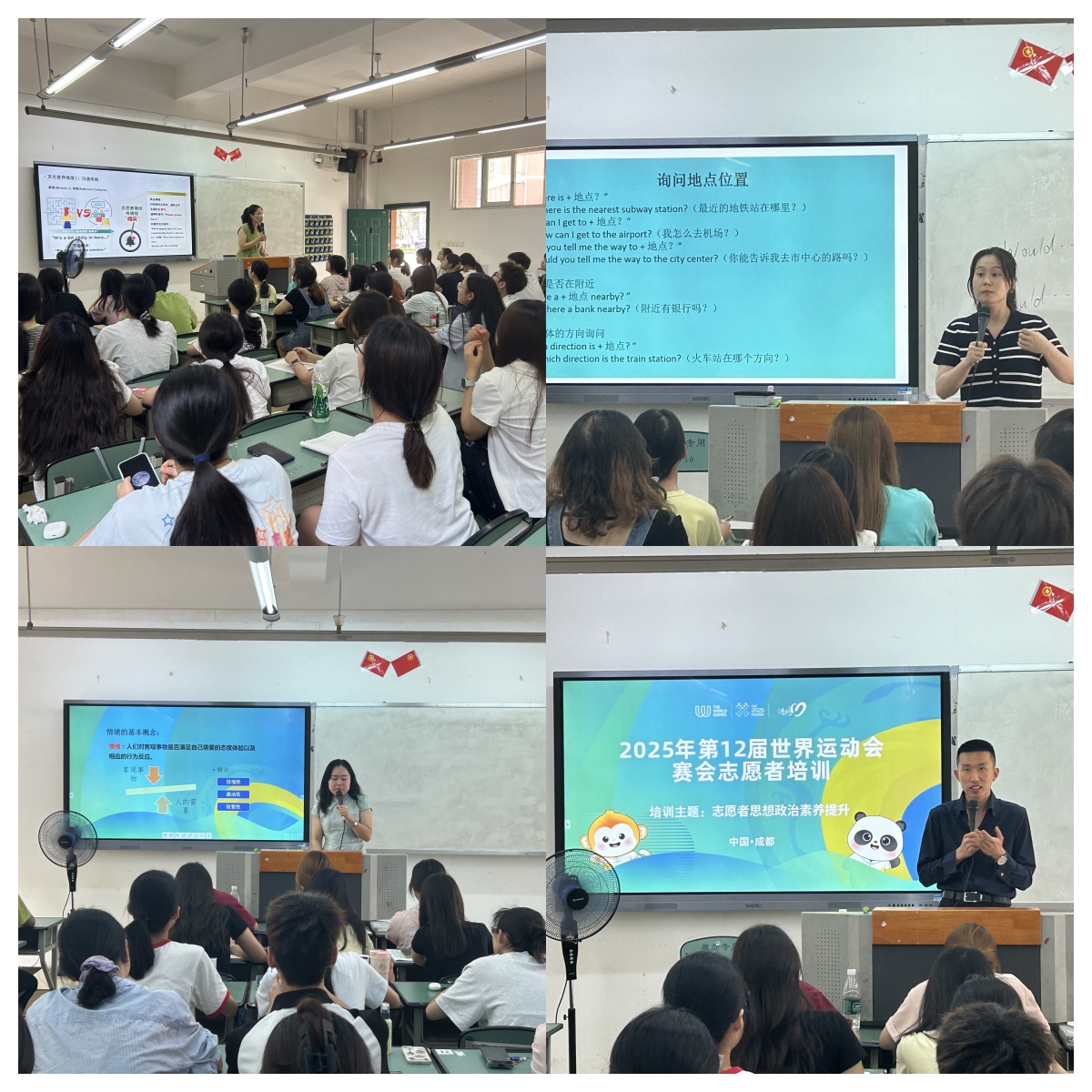 6月26日下午至27日上午,学院按组委会要求自主授课。英语教研室老师唐科堉、姜兆彩从文化差异入手,通过实战演练提升志愿者英语交流能力;心理健康中心老师韩怡然讲解安全防范与心理调适,保障志愿者安全高效服务;学工部负责人申洋以《国际赛事中的青年使命担当》为题,强调政治素养与志愿精神,全方位夯实志愿者专业基础。