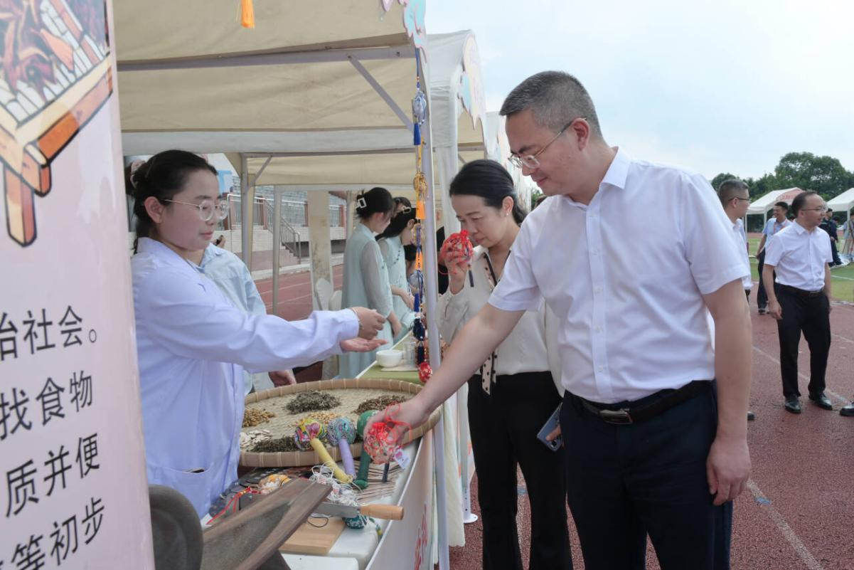 展示期间,德阳市委常委、统战部部长、市总工会主席卿伟,德阳市人大常委会副主任、德阳市中华职教社第二届社务委员会主任周新蓉等领导亲临学院展位。中药社学生重点展示了亮相2025中国-西非医疗健康产业博览会暨AI诊疗部署与项目合作峰会的中药香囊成果,获得领导们的高度认可。