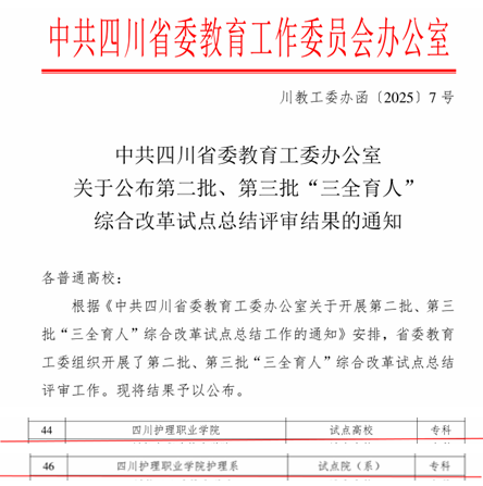 近日,中共四川省委教育工委办公室印发《中共四川省委教育工委办公室关于公布第二批、第三批“三全育人”综合改革试点总结评审结果的通知》(川教工委办函〔2025〕7号)。经专家评审、复核等程序,学院作为第二批“三全育人”综合改革试点高校,智慧护理学院作为第三批综合改革试点院(系),顺利通过试点总结评审(验收)。