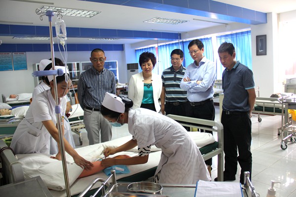 比赛临近,院校领导班子对训练情况非常关心,5月23日下午,学院党委书记江涛、院长张先庚、校长陈劲松、副校长赵斌、学校党委副书记钟海一行亲临比赛训练现场进行观摩。两名参赛同学进行了模仿大赛的技能展示,学院领导认真观看,并与指导教师进行了亲切交谈,张院长还亲自对两名同学进行了消毒、固定等操作示范。院领导对老师们的辛勤指导及学生刻苦训练给予充分肯定,鼓励她们再接再厉,并预祝两位同学在全国大赛再创佳绩。