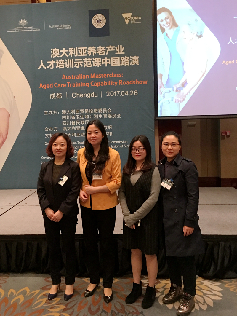 4月26日,由澳大利亚贸易投资委员会和四川省卫生和计划生育委员会联合主办的澳大利亚养老产业人才培训示范课中国路演(成都站)活动开幕,副院长姚永萍率学院5人代表团参加会议。