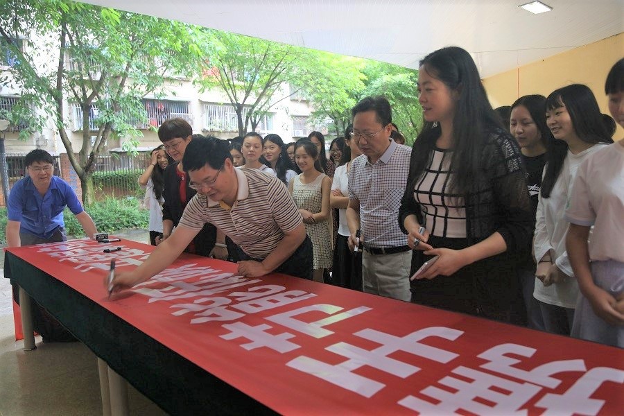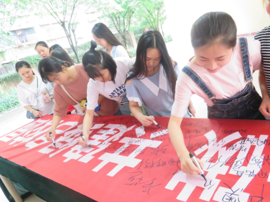 陈劲松、姚永萍、曾孝鹏、卢燕等学院领导及全院师生踊跃签名承诺:牢固树立勤俭节约、节能低碳的绿色生活理念,从自己做起,从节约每一度电、每一滴水、每一张纸的点滴小事做起,做践行节能好典范。