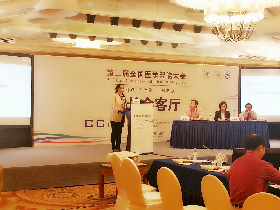 在分会场“管理者论坛”上,我院副院长姚永萍作了题为《以岗位胜任力为导向,构建护理虚拟仿真实验资源教学平台》的专题报告。姚副院长是唯一从“医护教一体化”角度来探讨医学智能的推广与应用的发言人。她的报告介绍了我院承建的迄今四川省唯一的“护理虚拟仿真实训中心”相关情况,倡导在“人工智能和医疗大数据”背景下,医疗教育实践教学与临床现实通过信息技术实现对接,做好“医教协同”的创新、共享与发展。与会的院士、专家和管理者肯定了姚副院长的报告并提出了建设性的意见。