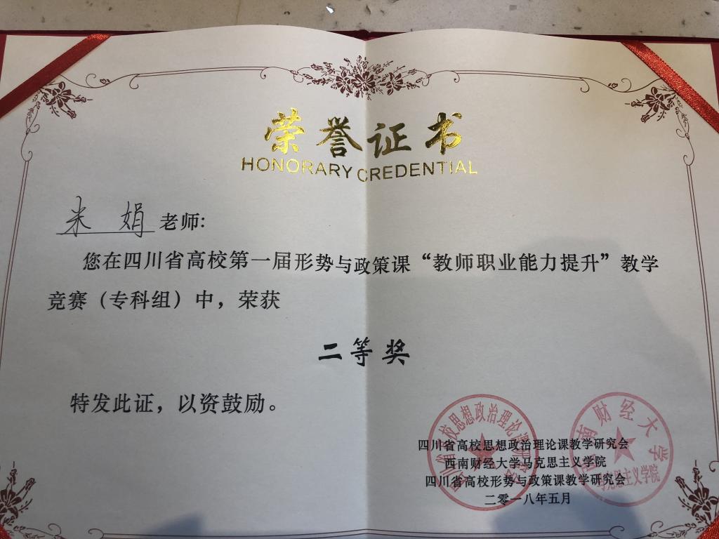 2018年5月12日,我院教师孟夏、米娟在四川省高校第一届形势与政策课“教师职业能力提升”竞赛(专科组)中,以优异的比赛成绩,分别荣获一等奖、二等奖。