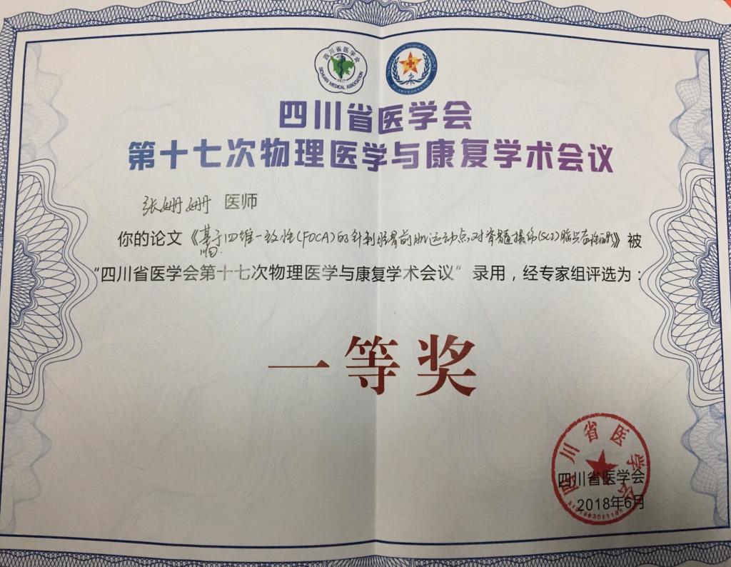 本次学术交流会议由四川省医学会主办,四川省医学会物理医学与康复专业委员会、凉山州中西医结合医院承办。此次学术论文交流,经过紧张激烈的专家评审和现场汇报、壁报交流,在收录的210篇学术论文中,我系张姗姗老师选送的“基于四维一致性(FOCA)的针刺胫骨前肌运动点对脊髓损伤(SCI)脑兴奋性的影响”在本次学术大会论文交流中获得一等奖。黄彬洋老师选送的“高职院校康复专业‘基于OT+’模块化的教育模式初探”在论文壁报交流中获得优秀奖。