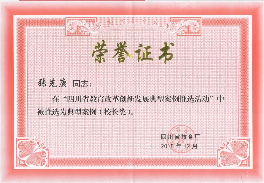 此次四川省共申报案例464个,主题为“教育奠定未来,改革引领时代”。经专家评审,教育厅审核,推选出90个典型案例,其中推选出15名“四川省教育改革创新发展校长类典型案例”,院长张先庚教授获此殊荣。