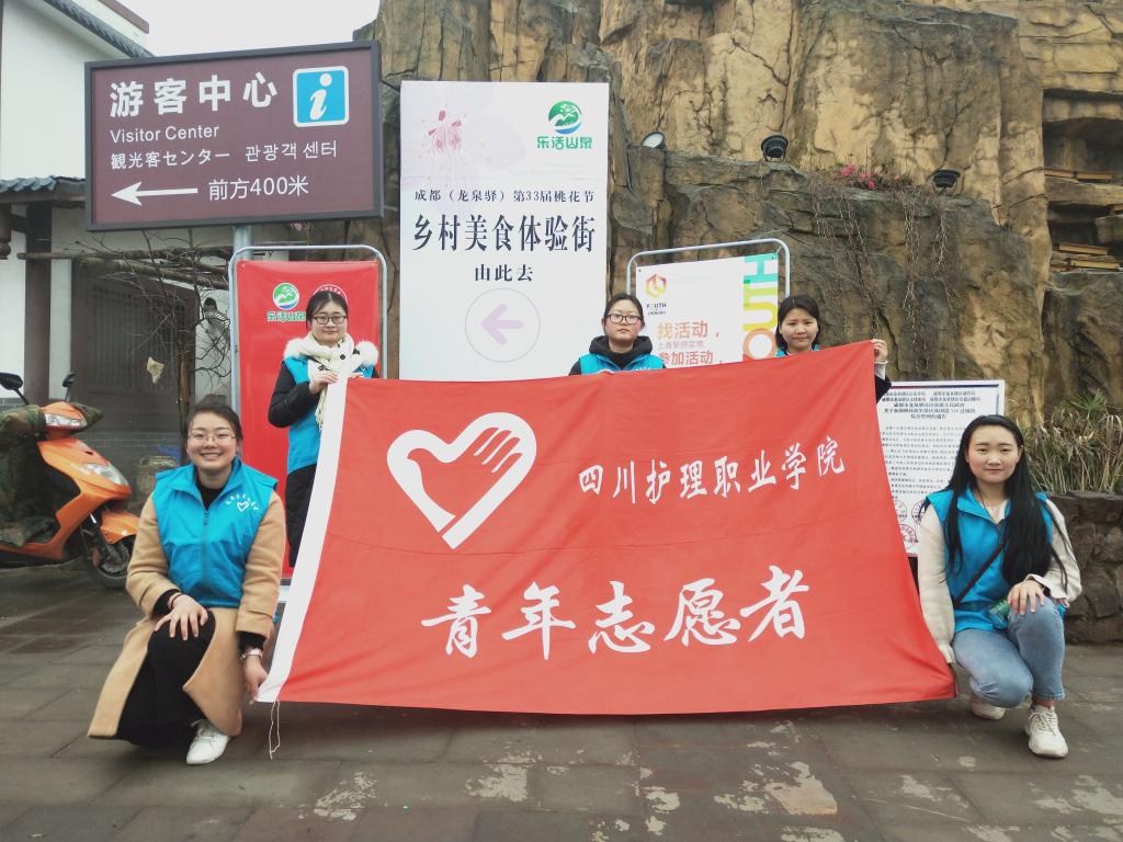 桃花故里喜迎八方游客。在龙泉驿区团委的安排下我院15名志愿者利用周末在“桃花故里”为来自四面八方的游客们提供路段向导、文明劝导等志愿服务。
