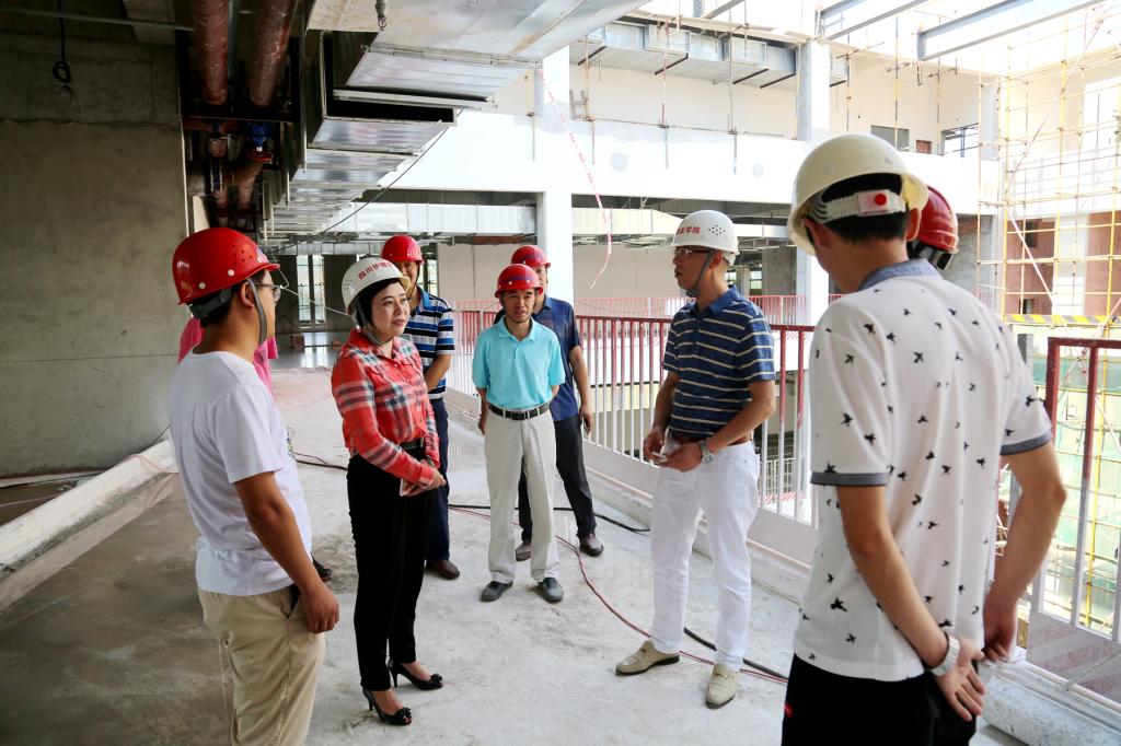 张院长一行深入图书馆查看水磨石楼面施工、地砖粘贴、钢结构屋面架设等,要求各单位管理人员齐抓共管,以建设学院优质工程为己任,严控施工质量,拒绝不合格产品;针对夏季高温天气,要关爱施工人员健康,做好防暑降温措施;在保证工程质量和安全的前提下,科学组织、高效推进。