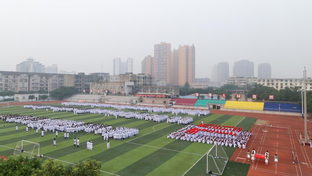升旗仪式上,国旗护卫队擎着鲜艳的五星国旗,迈着整齐划一、铿锵有力的步伐向旗台走去,在场的4000多名学生齐唱国歌,伴随着高昂的国歌声,五星红旗冉冉升起。国旗下500名川护学子手举国旗摆出了“70”字样,为祖国70华诞献礼。