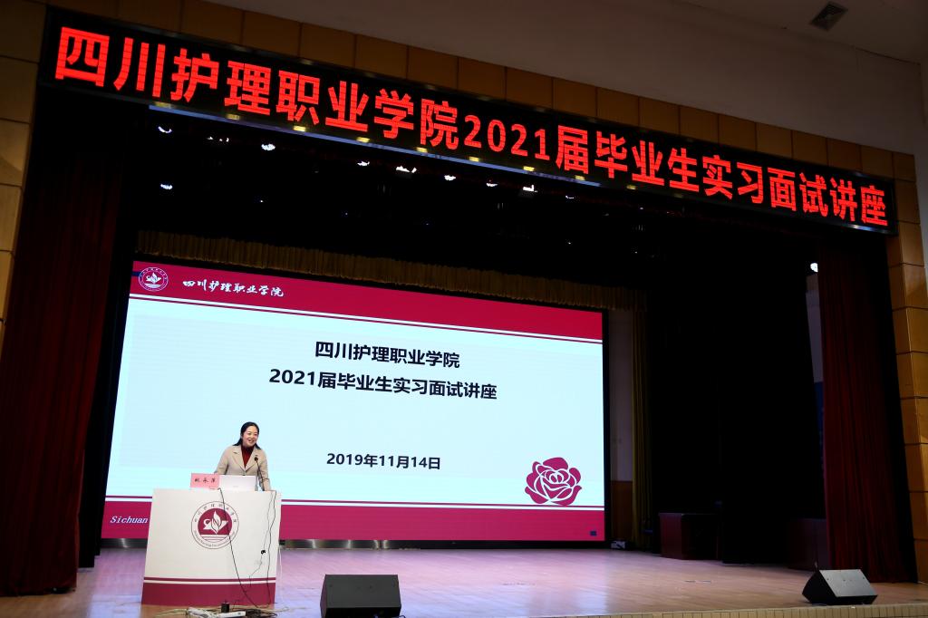 第一阶段的面试指导培训及优秀毕业生实习交流会,学院邀请四川省护理学会副会长、西部战区总医院原护理部主任王红梅、西部战区总医院急诊科ICU护士长徐彭杰(参加新中国成立70周年阅兵式)、辉瑞中国校园招聘负责人郭小凤及范孝儒、王宏博两名优秀毕业生到校进行面试指导培训和经验分享。使学生对临床实习、实习基地以及简历制作等有了全面深入的了解,有效提升了学生的面试技巧,为临床实习奠定了坚实的基础。