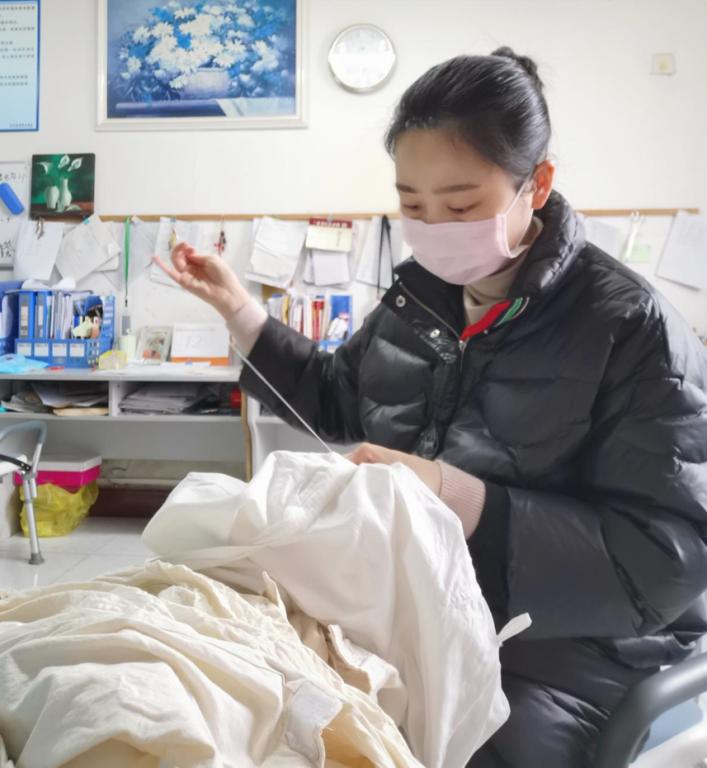 作为实训部的一名普通党员教师,陈柯如在加班加点完成实训室库存口罩、消毒液及体温枪等防控用品的清点任务后,得知附属医院防护服短缺,从家里拿来针线,将实训室里腰带袖带缺损的布类隔离衣一针一线的缝补整理好送到附属医院。当她在听到学院院长张先庚组建抗击新型冠状病毒感染肺炎爱心志愿服务队时,又主动请缨,申请加入志愿队伍,并结合自己多年在临床上的工作经验与学院其他专家团队一起共同编写了新冠肺炎社区居家防护手册老人篇和学生篇。