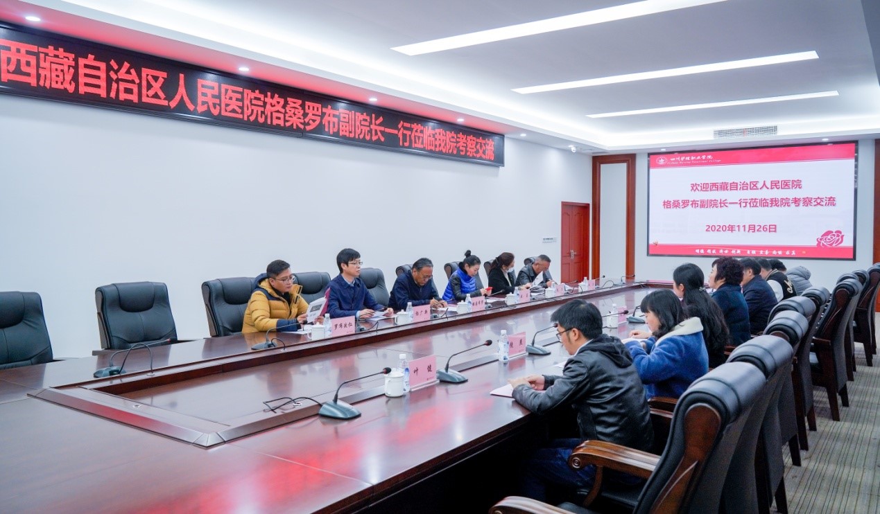 2020年11月26日下午,西藏自治区人民医院副院长格桑罗布一行6人到我院考察交流。学院院长张先庚、副院长姚永萍、学院附属医院合并移交工作专班副组长苏世甸、附属医院工会主席饶燕等参加了考察交流活动