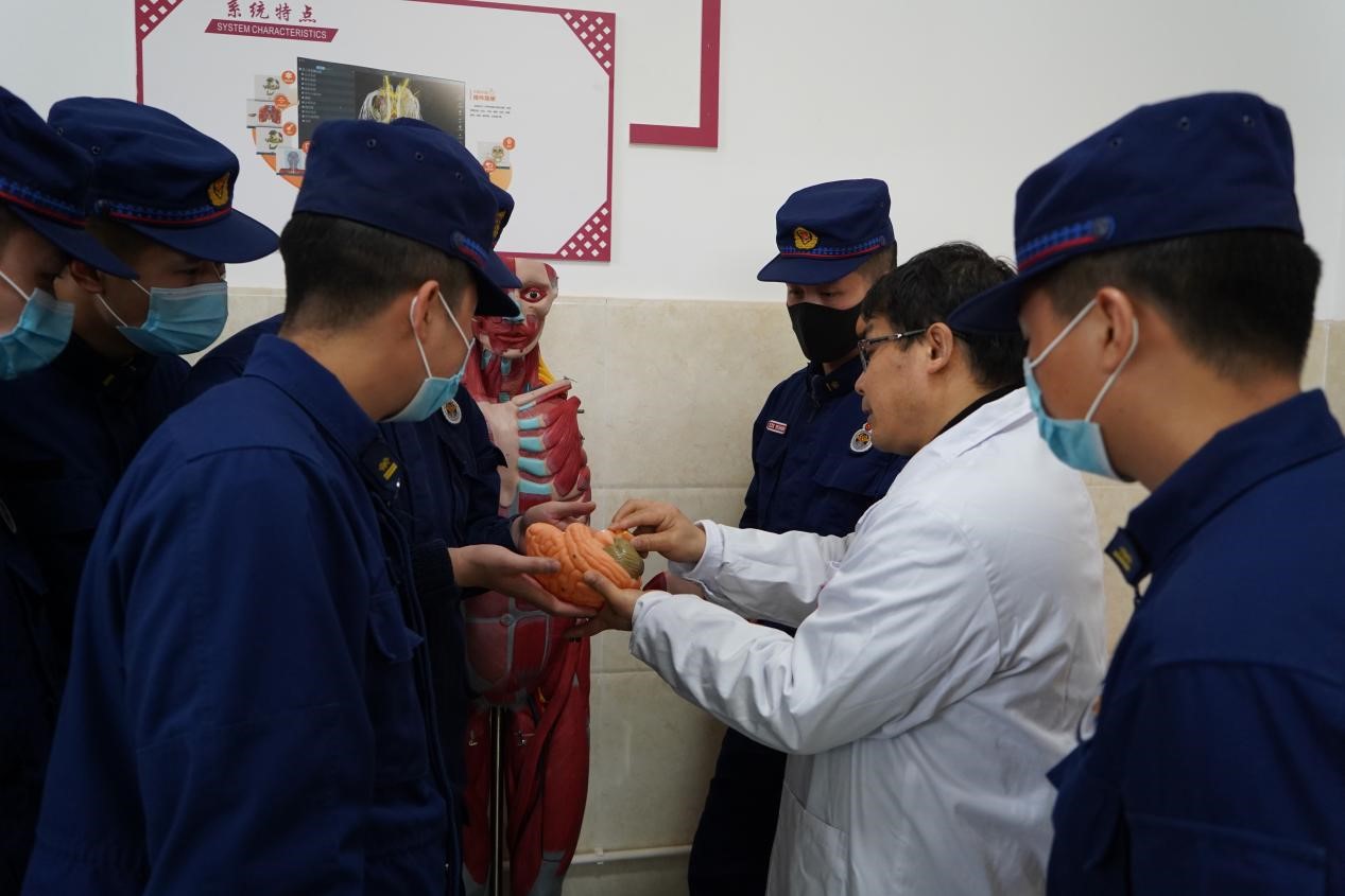 在人体形态结构模型展示柜前,官兵们直观看到人体骨骼、血管、脏器等形态。我院教师结合消防救援人员的真实救援案例,向官兵们讲解了受伤人员的救护要点。