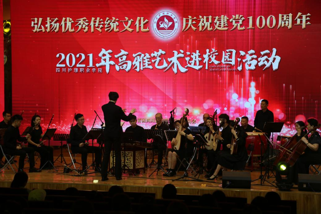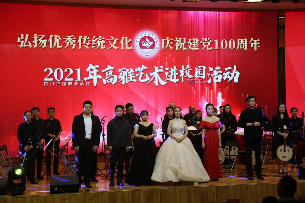 活动中,30余名乐团演职人员用他们精湛的技艺、强烈的表现力为川护师生带来了一场艺术盛宴。《金蛇狂舞》《彩云追月》《春江花月夜》《茉莉花》等器乐合奏让人领略了不同乐器在听觉上带来的享受;重奏《雪落下的声音》《九儿》让人们惊叹演奏者之间高度的默契和相互配合;《十送红军》《我的祖国》《唱支山歌给党听》等声乐表演展现了国家在中国共产党的指引下蒸蒸日上的繁荣景象。此次活动以高雅艺术进校园为教育载体,将高雅艺术融入校园文化建设和学生思想政治教育中,在提高学生艺术素养的同时,也激励广大师生增强爱国之情,砥砺强国之志,实践报国之行。